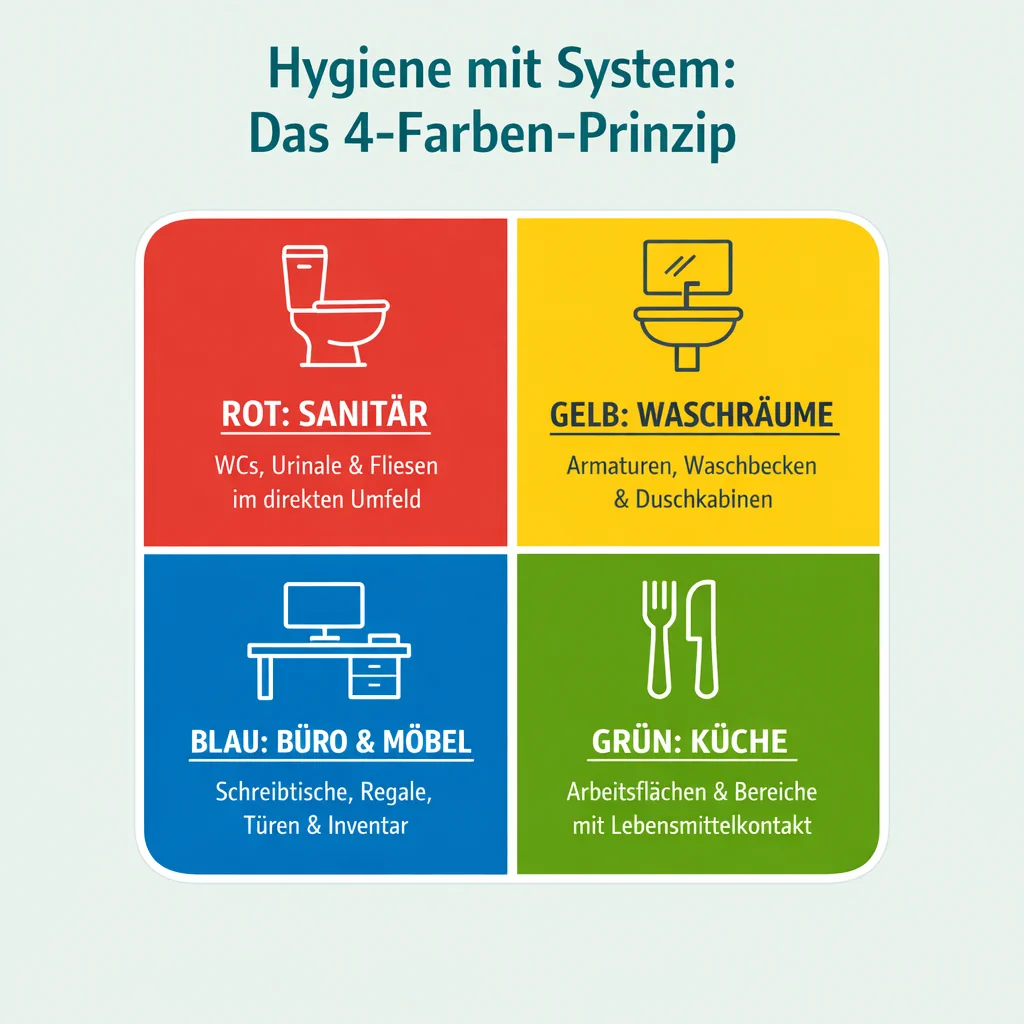 Wer eine Reinigungsfirma beauftragt, erwartet mehr als nur eine optisch saubere Oberfläche. Es geht um echte Hygiene, den langfristigen Werterhalt Ihrer Immobilie und vor allem um die Gesundheit aller Personen, die sich darin aufhalten. Ein entscheidendes Werkzeug, um diese hohen Standards sicherzustellen, ist das sogenannte 4-Farben-System.