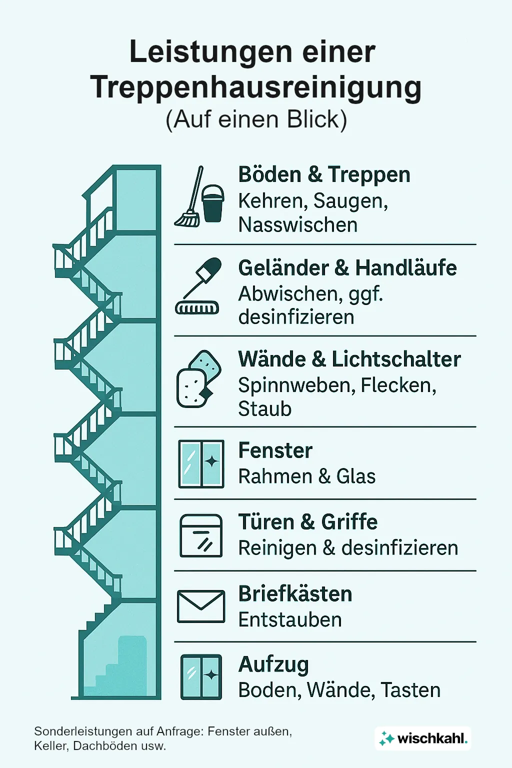 Diese Zusatzleistungen werden individuell vereinbart und sind nicht automatisch Teil jeder Standard-Treppenhausreinigung.