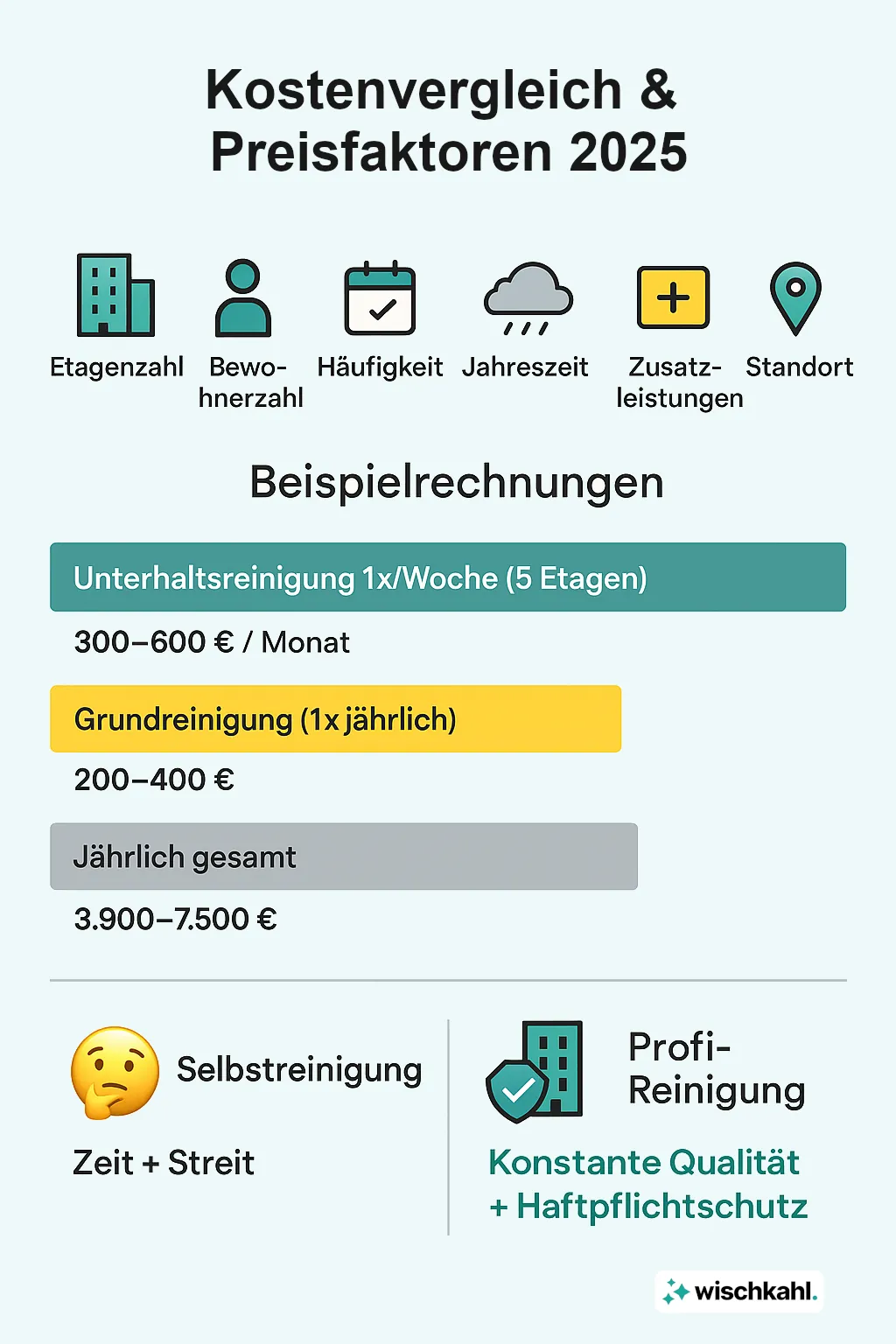 Die Kosten für die Treppenhausreinigung variieren je nach Umfang, Größe des Gebäudes und Häufigkeit der Reinigung. Im Folgenden finden Sie realistische Richtwerte für 2025.