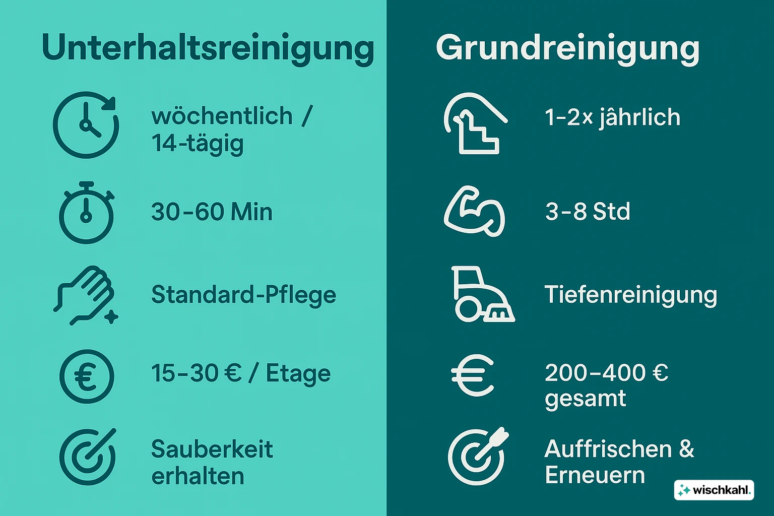 Wichtig ist die Unterscheidung zwischen der regelmäßigen Unterhaltsreinigung (wöchentlich/14-tägig) und der intensiven Grundreinigung (1-2x jährlich). Für ein dauerhaft gepflegtes und hygienisches Treppenhaus empfiehlt sich die Kombination beider Reinigungsarten.
