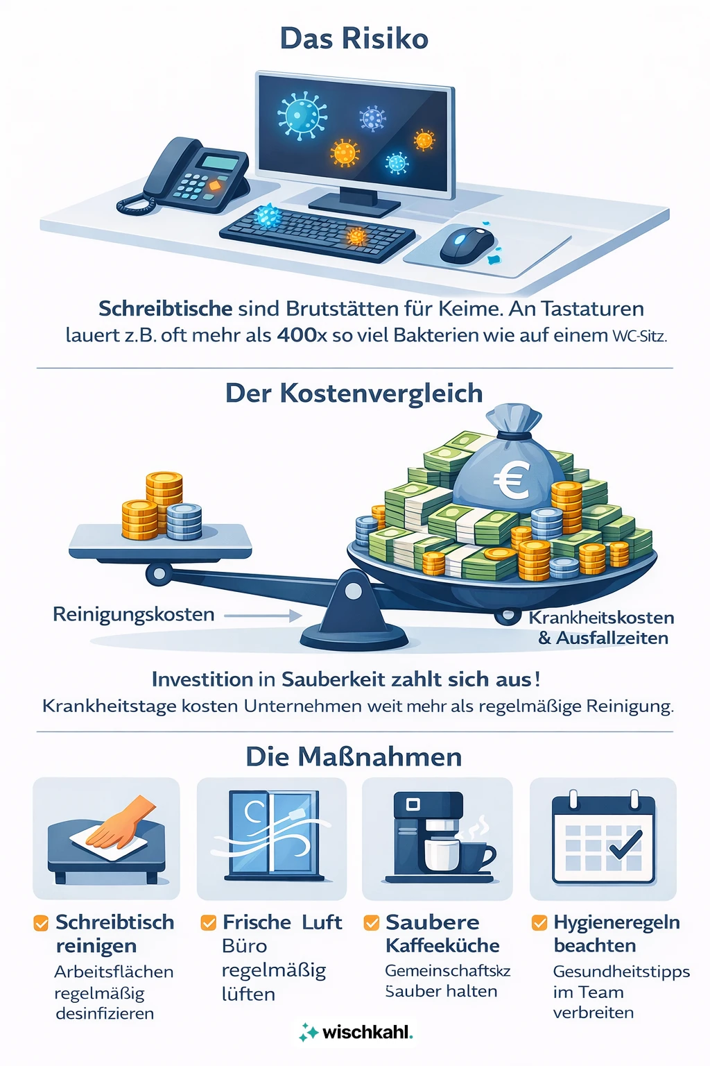 Wissenschaftliche Studien belegen, dass Atemwegsinfektionen mit 13,2% die häufigste Ursache für Fehltage in Deutschland sind. Die Keime verteilen sich besonders effektiv in Büroumgebungen: Tastaturen, Telefone und Türgriffe sind idealer Nährboden für Bakterien und Viren. Eine einzelne kontaminierte Oberfläche kann Auslöser für Ketteninfektionen in Ihrem gesamten Unternehmen sein.
